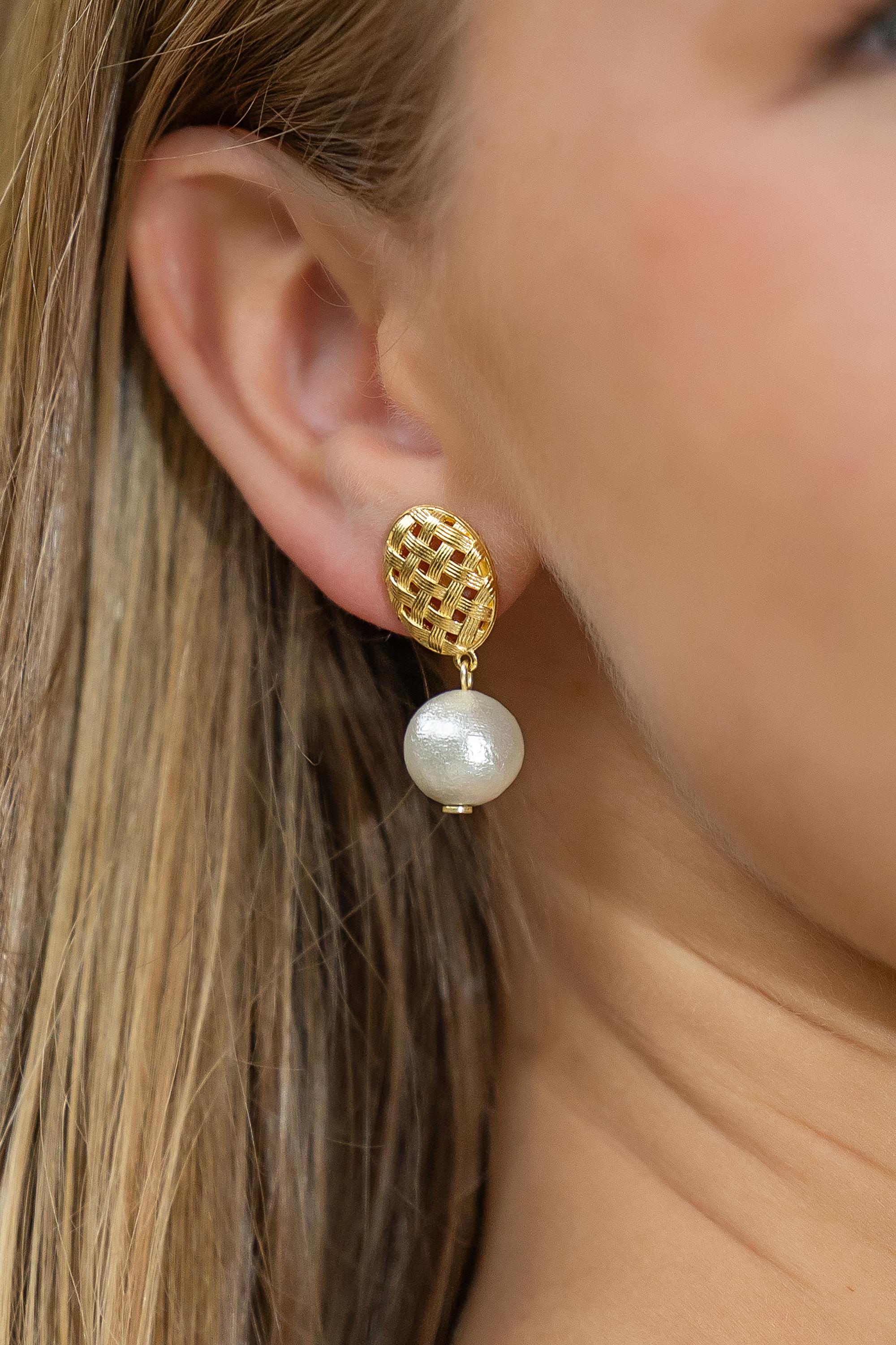 Catherine Gold Basketweave & Single Cotton Pearl Earrings