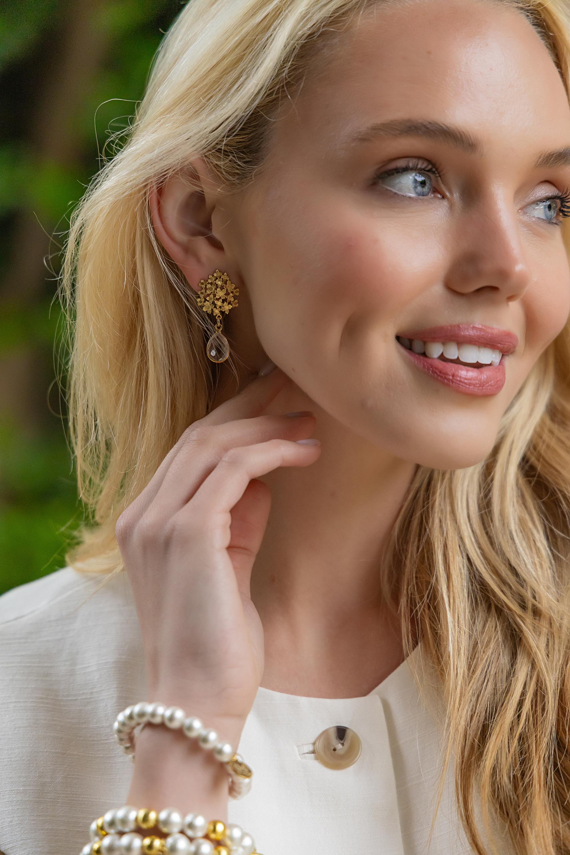 Jardin Hydrangea Gold Clear Crystal Quartz Earrings