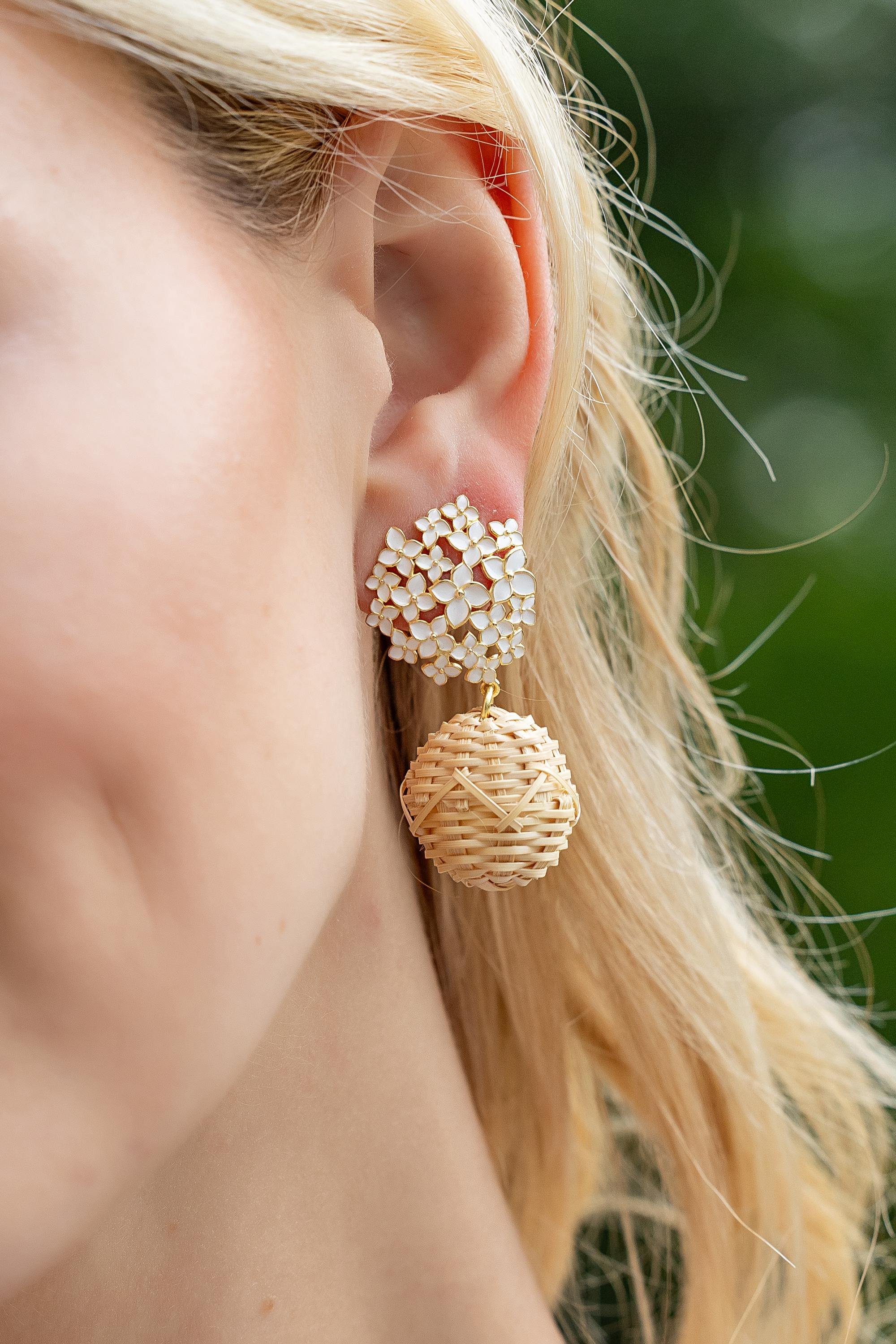 Delicate white enamel hydrangea flower cluster posts with woven rattan ball. Beautiful, lightweight and easy to wear. Also available in Clip On version.
