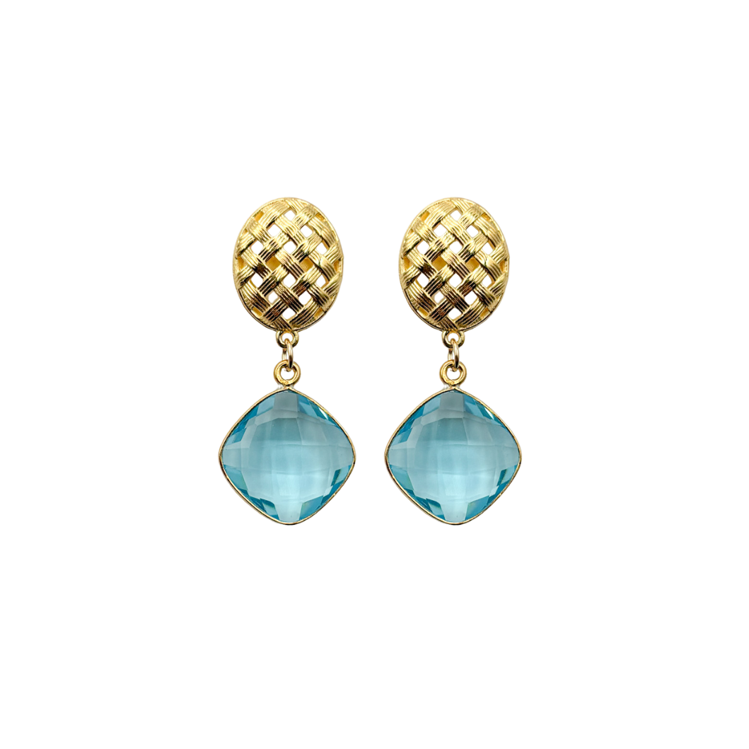 These elegant earrings feature a gold basketweave stud, paired with a single aqua blue quartz gemstone, set in a delicate gold frame. Wear them seamlessly from day to night.