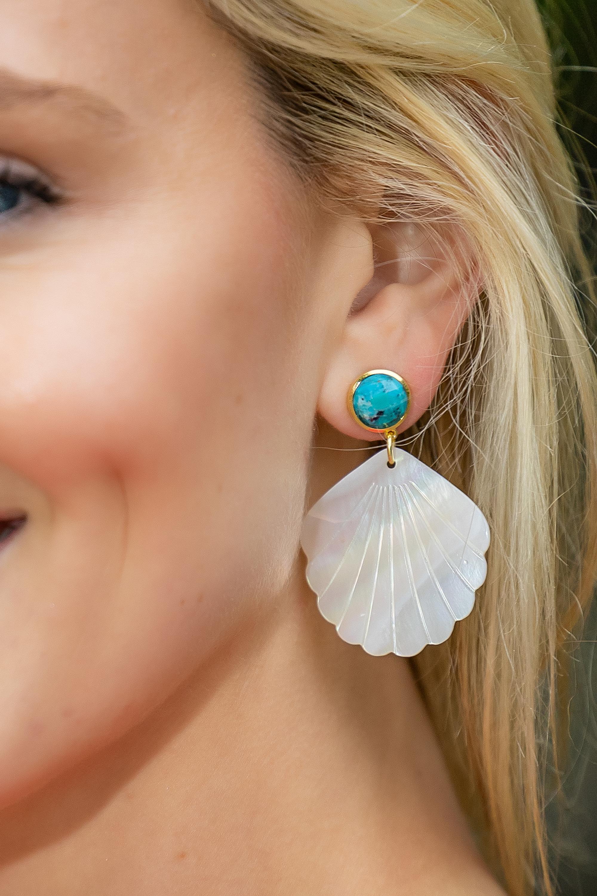 These earrings give all the best summer feels! The semi-precious turquoise gemstone post with lightweight mother of pearl shell drop are perfect for your next vacation!